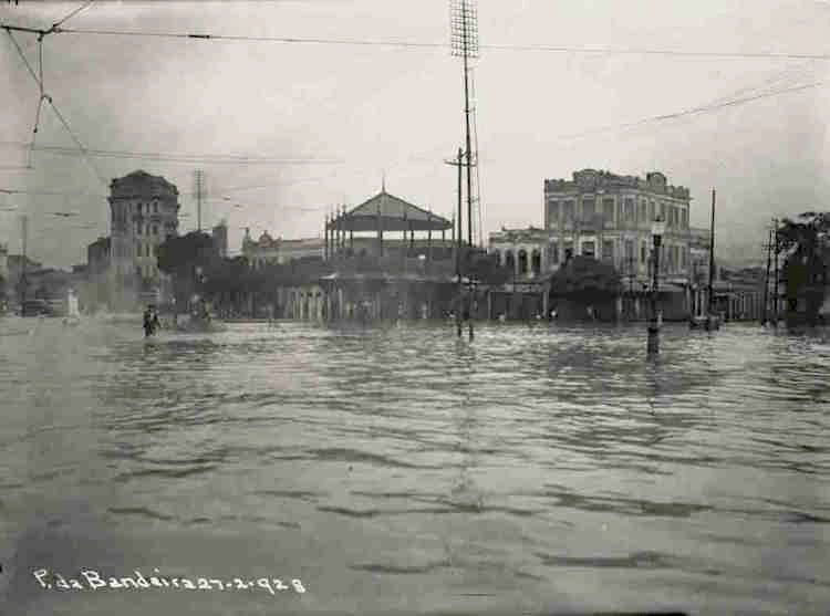 The expansion of Rio de Janeiro in the 19th-20th centuries depended on draining wetlands, filling marshlands and Guanabara Bay, and channeling and burying rivers — including the Rio Carioca, which gave Rio natives their name. Large portions of those buried sites — including the area where Praça da Bandeira, mentioned in the song, is located — lie below sea level.